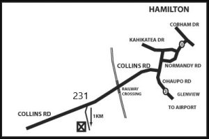 Our “Reekers flying field” is located at 231 Collins Road, Melville. Heading south out of Hamilton on Ohaupo Road (SH 3), turn right onto Collins Road at the traffic lights, opposite the Urlich Ave Shopping Centre. The access track to the field is located 2.3 km west along Collins road, not long after passing over the railway lines. Look for the “ofi TheLand Collins Road # 7015” sign and the Model Aircraft sign on your left side next to a long private accessway (a tanker track). Take this metal track straight for 1 km south and you will find the flying field on the right hand side. Please drive slowly (no faster than 30 km/h). Park on the sides of the track or in the parking area immediately adjoining the Pits in the paddock.